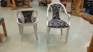 Les 2 chaises ont été décapées et le bois repeint en couleur argentée.