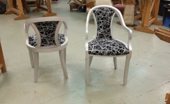 Les 2 chaises ont été décapées et le bois repeint en couleur argentée. L'assise a été refaite (sangles, ressorts, tissu de jute) ainsi que le dossier. Le tissu utilisé est zébré de lignes argentées qui rappellent la peinture utilisée pour la structure. Les 2 chaises sont à vendre. Contactez moi […]
