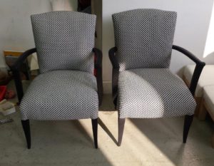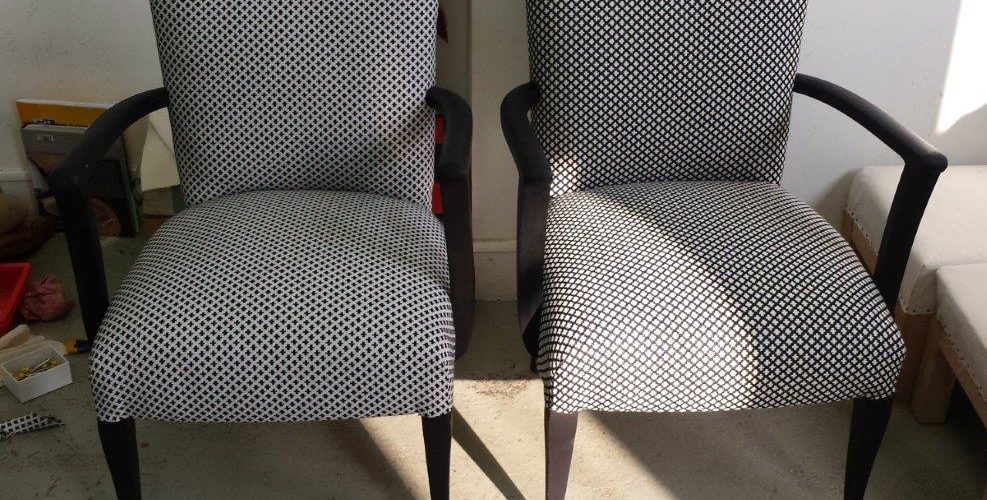 Duo de Fauteuils Bridge restaurésBillet publié dans Restauration Fauteuil le 21 décembre 2016 Duo de Fauteuils Bridge Réalisés avec le même tissu, mais posé à l'endroit pour l'un et à l'envers pour le second. Le bois a été poncé, préparé puis recouvert d'une teinte noire Napoléon III Plus de détails dans la rubrique 'Avant-Après' Partagez avec vos amis - Merci !